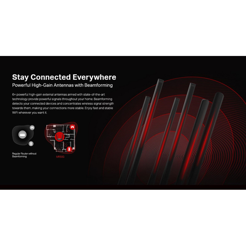 Με ασύρματη ταχύτητα 1300 Mbps από τη ζώνη 5GHz και 600Mbps από τη ζώνη 2.4 GHz, το MR50G σας προσφέρει την ευελιξία δύο αποκλειστικών δικτύων και εξασφαλίζει εκπληκτική ασύρματη απόδοση.