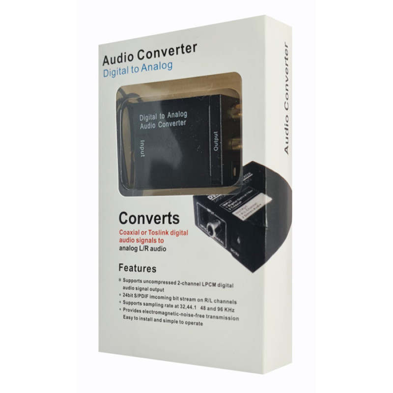 Αυτός ο αντάπτορας ψηφιακού σε αναλογικού σήματος ήχου, είναι σχεδιασμένος για οικιακή ή επαγγελματική χρήση. Μετατρέπει το ψηφιακό σήμα ήχου μέσω RCA (Coaxial) ή Toslink σε αναλογικό σήμα ήχου μέσω L/R RCA.
