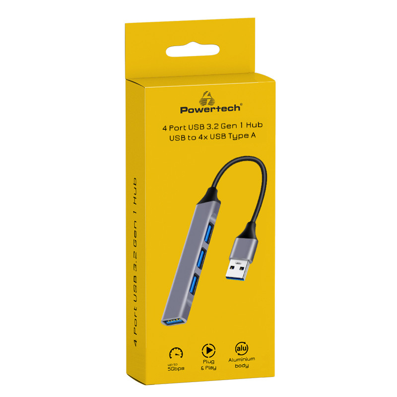 Το hub της Powertech συνδέεται στον υπολογιστή σας μέσω ελεύθερης θύρας USB-C, επεκτείνοντας τις θύρες του με 1x USB 3.2 Gen 1 και 3x USB 2.0 Type A θύρες.